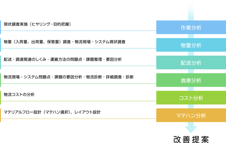 物流コンサルタントが物流センターを視察し各拠点へのヒアリングなどを実施、また、在庫・出荷・入荷データをお預かりして、問題点の分析を行います。そのうえで、現状の物流コストの調査から最適化のためのソリューションを提案いたします。